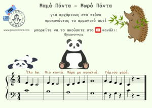 Ένας 6χρονος αρχάριος μαθητής έφερε το αγαπημένο του λούτρινο παιχνίδι, μία μαμά Πάντα να κρατάει στην αγκαλιά της ένα μωράκι Πάντα ‘ . Και έτσι φτιάξαμε ένα τραγουδάκι. Του έμαθα μόνο την 2η φωνή και την συνδύασα με βήματα/ρυθμό. Όταν το έμαθε καλά και μπορούσε να το τραγουδά μόνος του άρχισα να τραγουδώ την 1η φωνή, την μελωδία. Στην αρχή αρκετά σιγά ώστε να μην τον ‘ενοχλώ’ να μην τον εκτροχιάσω από την δική του 2η μελωδία. Όταν κατάλαβα πως δεν επηρεάζεται, άρχισα να τραγουδώ την μελωδία κανονικά. Και κάπως έτσι ξεκινάμε να προπονούμε το αρμονικό αυτί που ακούει κάθετα, σαν αρμονία και όχι απλά να πατά σωστά τις νότες και να τραγουδά ‘καθαρά’ στην τονικότητα. Δείτε εδώ ένα βίντεο με το τραγούδι και τα βήματα. Για περισσότερα Piano Comics μπείτε εδώ.