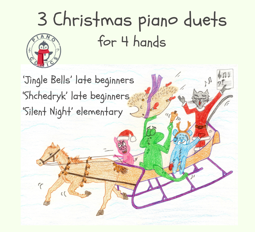 The ‘3 Christmas piano duets’ arranged by Piano Comics include ‘Jingle Bells’, ‘Shchedryk’(Carol of the Bells) and ‘Silent Night’ for 4 hands on 1 piano. First two are for late beginners and the third one for elementary levels. There are colorful illustrations while the scores are wide and large, making it more comfortable and appealing for kids and teenagers to read.  Free samples available here.
