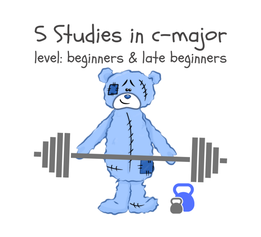 The 5 Studies by Piano Comics are for level beginners and late beginners . All studies are written in c-major tonality. The first 3 studies are for beginners: only treble clef, one hand position and no finger turns. The last 2 studies are for late beginners: treble and bass clefs, intervals, with finger turns. Here is a free sample of the beginning of all 5 studies.