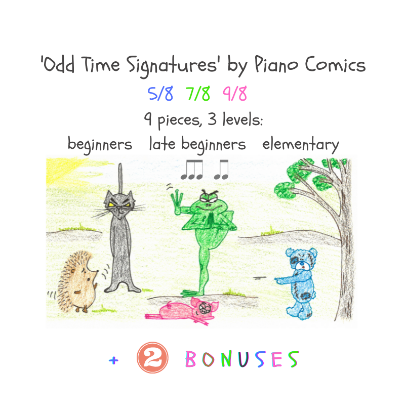 ‘Odd Time Signatures’ by Piano Comics consists of 9 pages ( PDF files ) plus 2 bonuses ( 2 pages and 1 mp4 video ). All pieces are in c-major tonality and the time signatures used are 5/8, 7/8, and 9/8: 3 pieces for each = total 9 pieces. Each time signature has 3 pieces from 3 different levels: beginners, late beginners and elementary. The compositions for beginners have also rhymed lyrics with the melody, one hand position and no finger turns. Here you can read more about this product and here the 2 bonuses are explained. Download and use directly the 1st page as a free sample here.